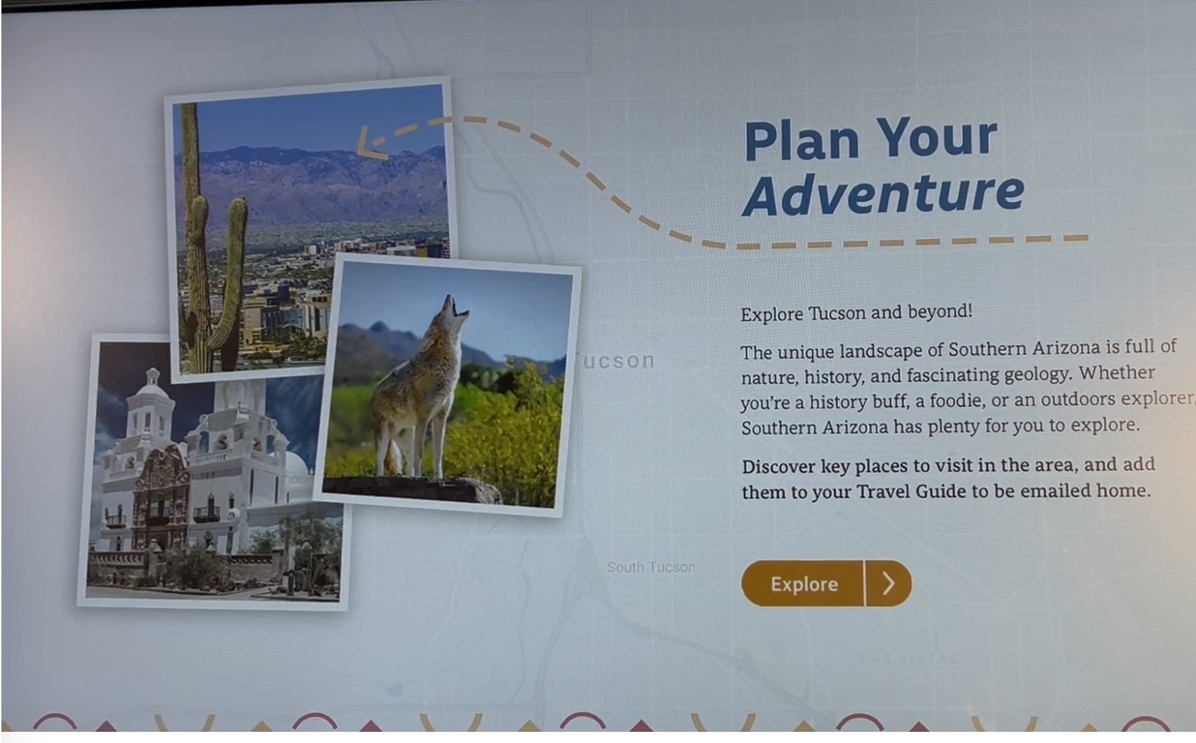 At the four corners of this map are electronic screens that can help you plan your “adventures” in Southern Arizona while looking at the map. What a great idea!