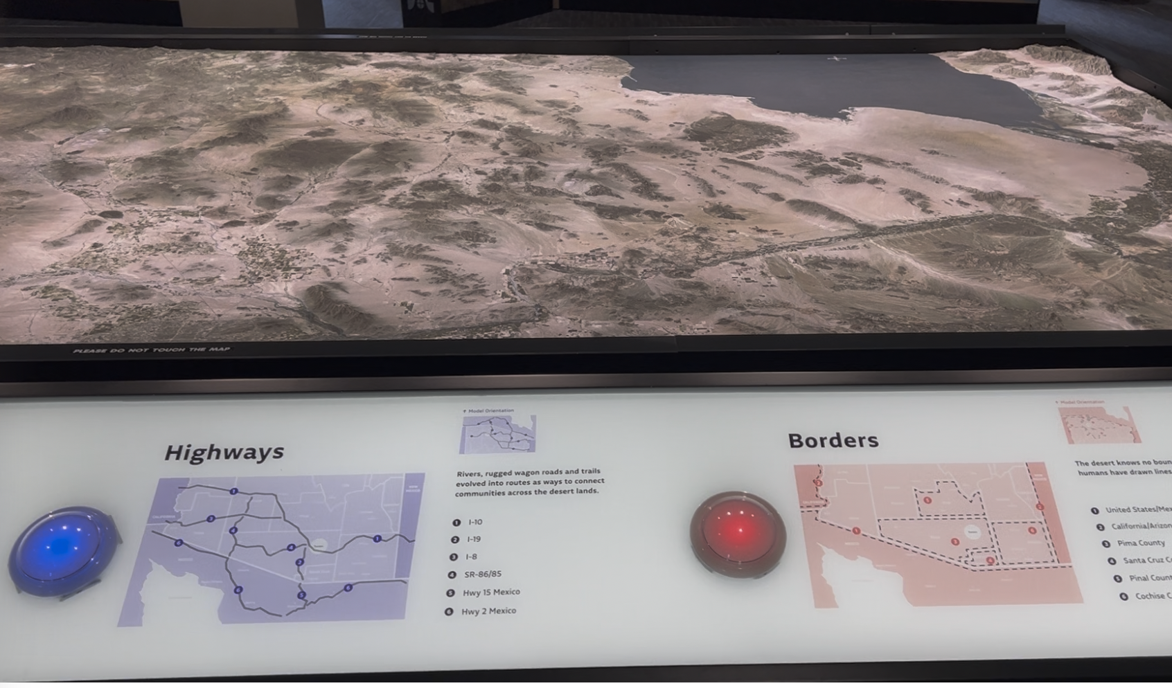1. The muted lighting is a nice contrast to the bright lights that are highlighting the nearby Interactive Relief Map. It is also a reminder that in the desert the cooler nights are when a lot of activity takes place.