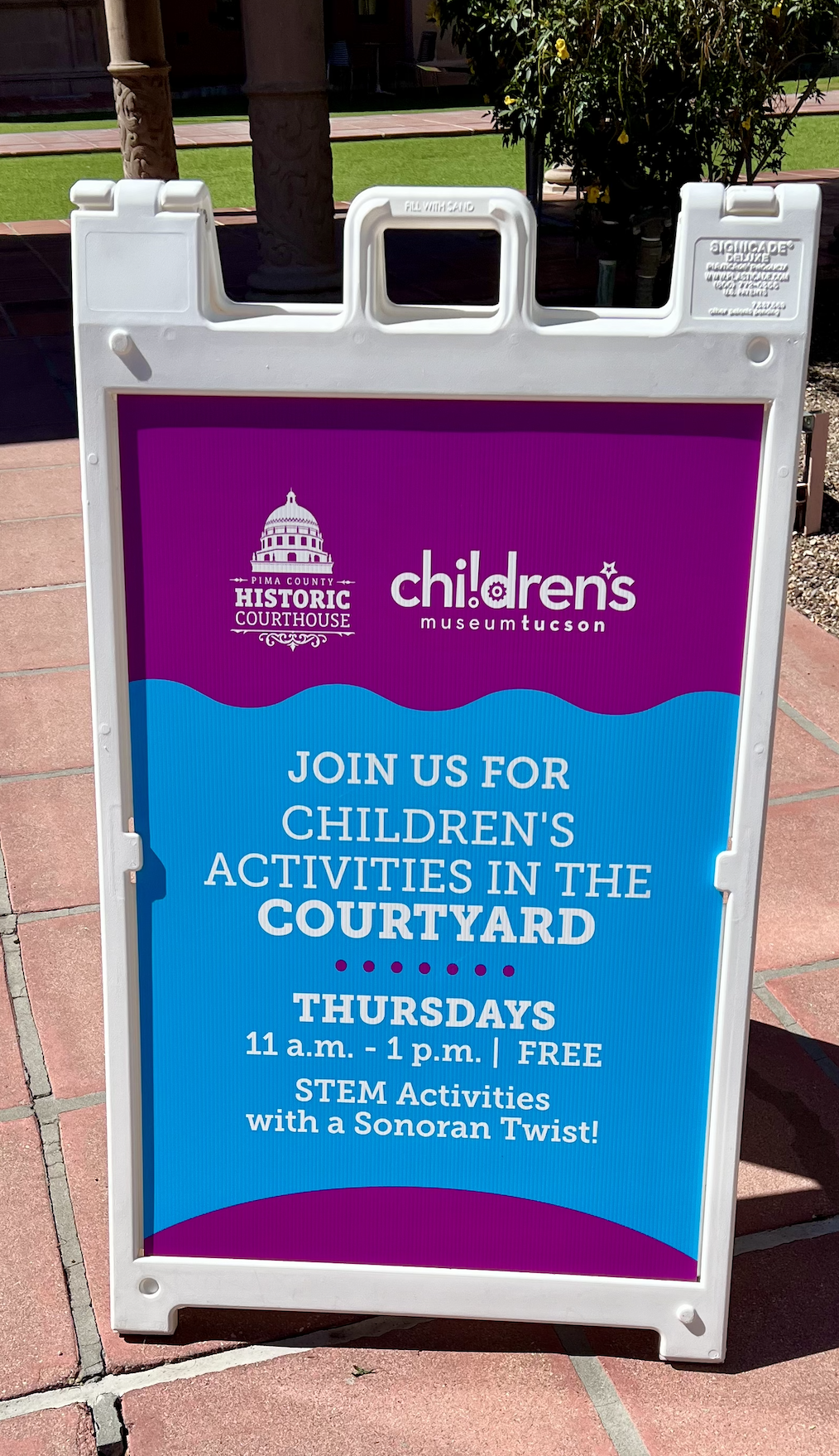 First, the architecture is pleasing and the courtyard is clean. There are portable A-frame signs to help direct the visitor to either the SAHVC, the University of Arizona’s Alfie Norville Gem and Mineral Museum or to announce the day’s event. Wednesdays and Friday’s music fills the courtyard, Tuesdays there are lawn games to play, and on Thursdays children’s activities are led by the Tucson Children’s Museum staff. The entire area is alive with the sounds of people enjoying themselves. Plus, it is energizing to hear and see the activity when you enter and leave.