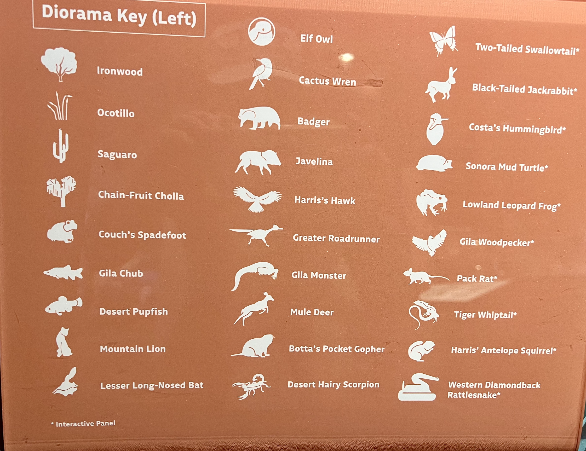 While this 16 foot (5 m) long display did not contain every single plant and animal species in the Sonoran Desert, it did provide 29 of the most iconic plants and animals that you might encounter – or at least be curious about like a saguaro, rattlesnake, pack rat, ocotillo, roadrunner, spadefoot toad, coyote, etc.. (See link to a video of this exhibit at the end of the post)