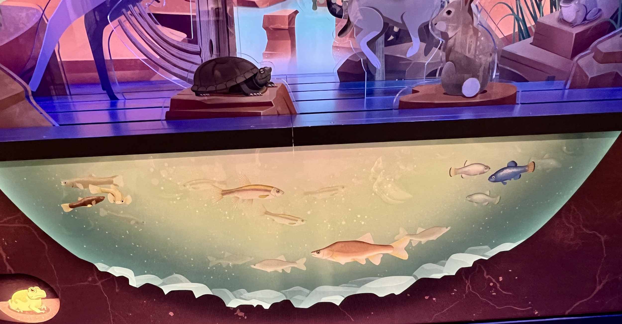 4. By not labeling each of the individual displays the attention and curiosity of the visitor can focus on the plant or animal, not on a label. There is a key at either end of the display with a small picture of each plant and animal with its common name for those who need to know.